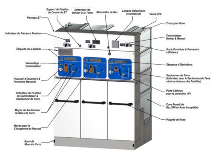 La cellule et le jeu de barre sont contenus dans une cuve en acier inoxydable remplie de SF6 à 0.03MPa (relative) pression pour assurer les fonctions d’isolation.